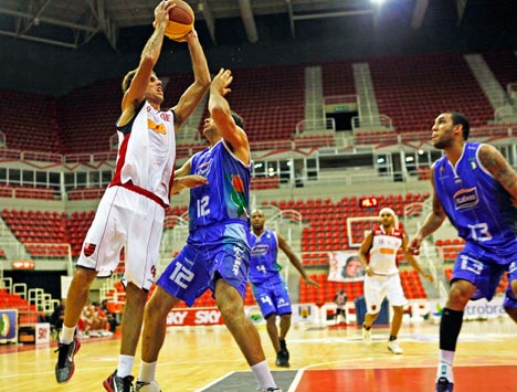 Marcelinho é marcado por Renato na Arena HSBC novamente vazia… Foto de Leandra Benjamin/Fla Imagem/NBB (inclusive home)