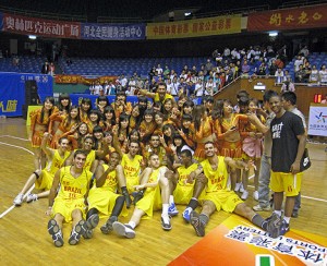 Molecada comemora em meio às cheerleaders chinesas. Foto de divulgação/Guerrinha