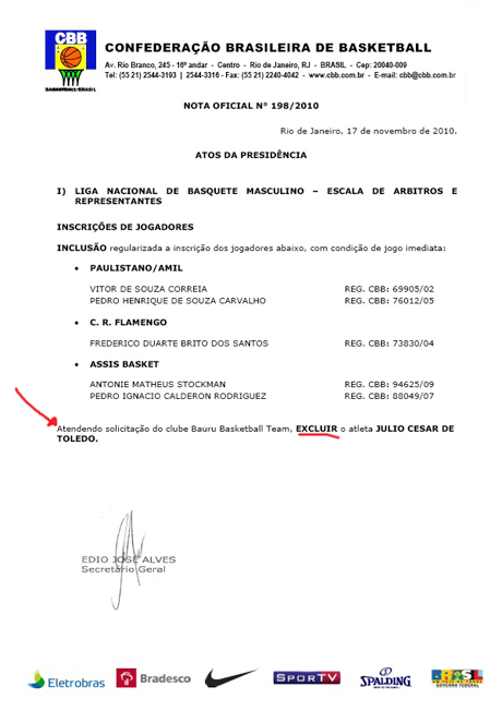 Guerrinha havia dado pistas, em entrevista ao Jornada Esportiva, no início de outubro, sobre a saída de Júlio Toledo. O jogador não rendeu por aqui e, com contrato vencendo em dezembro, não poderia atuar por outro time no NBB se entrasse em quadra. Pois agora é oficial, está na nota nº 198/2010 da Confederação Brasileira de Basquete, publicada ontem e reproduzida abaixo.