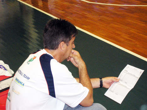 Guerrinha analisa scout no intervalo do duelo com Brasília: números são fundamentais (foto minha)