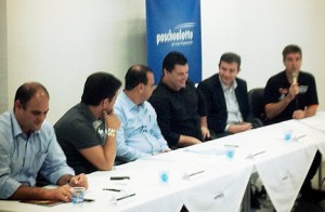 Diretoria da Paschoalotto, do Bauru Basket e da LNB presente, com Guerrinha, na coletiva de anúncio do acordo – foto reproduzida do Facebook de Alexandre Alves, assessor de comunicação do Grupo NP