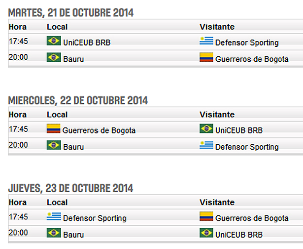 O Dragão receberá, entre os dias 21 e 23 de outubro, Brasília (atual campeão), Guerreros-COL e Defensor-URU. Confira, abaixo, a tabela do grupo D, reproduzida do site da Fiba Americas.