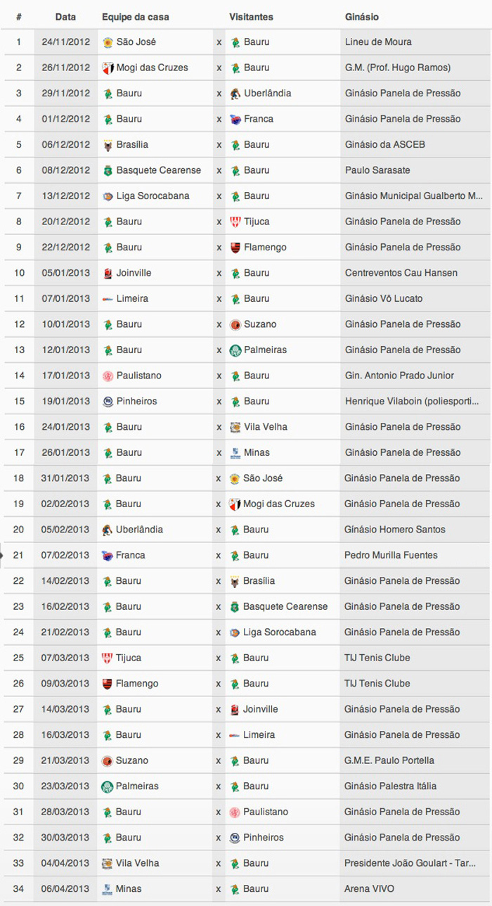 A Liga Nacional de Basquete divulgou nesta quinta (5/9) a tabela da fase de classificação do Novo Basquete Brasil 5 (temporada 2012/2013) – cumprindo a antecedência exigida pelo Estatuto do Torcedor (ponto para a LNB). A competição bate o recorde de participantes: serão 18 times lutando pelo título, sendo 14 da edição passada (a ausência é Araraquara, afastado por problemas financeiros) e quatro novidades: Suzano (com a franquia de Assis, Mogi (campeão da Supercopa Brasil), Palmeiras (vice da Supercopa) e Basquete Cearense, que adquiriu franquia e entrou após a concordância dos demais clubes. Entre os inscritos, ficaram de fora Vitória e Londrina.
