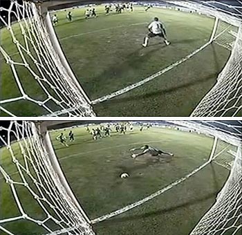 Luis Henrique posicionou-se atrás da barreira, deu passo em falso para a direita e, depois, não alcançou a bola no canto esquerdo