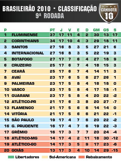 Enquanto o Santos, sem Ganso, tenta mostrar ainda ter forças para lutar pela tríplice coroa, o Internacional é uma certeza: irá perseguir os líderes, torcendo por tropeços. Só espero que não desacelere o bom futebol quando chegar às vésperas da disputa do Mundial – exatamente nas últimas rodadas do Brasileirão.