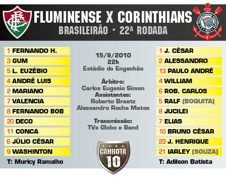 • O Timão sofre com desfalques (Chicão e Ronaldo) e uma dúvida (o tornozelo de Ralf). Souza no lugar de Iarley foi uma opção testada no treino da véspera para preocupar os defensores tricolores e abrir espaço para Jorge Henrique e Bruno César chegarem mais soltos à area.