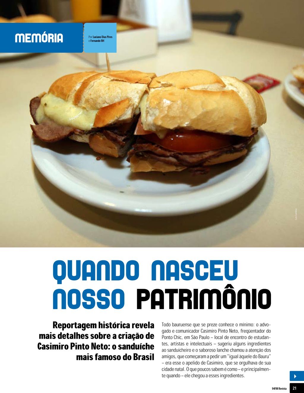 A partir de entrevista do jornalista e historiador Luciano Dias Pires com o político/médico que inspirou a criação de Casimiro Pinto Neto, não foi difícil juntar as peças e descobrir que o legítimo Sanduíche Bauru não foi criado em 1934, como afirma equivocadamente o site oficial do sanduíche, nem em 1937, como consta em quadro no Museu Histórico Municipal. Essa reportagem a quatro mãos foi publicada na edição 17 da 94FM Revista, do final de 2007, mas não ganhou o eco merecido. Uma descoberta histórica da qual me orgulho. A foto em destaque na home é do competente Luís Cardoso.