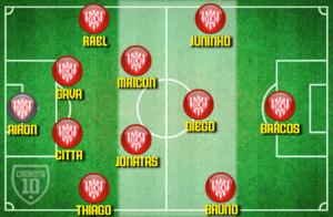O 4-5-1 de Sangaletti: variação defensiva do 4-4-2 inicial, com o recuo de Bruno Rodrigues