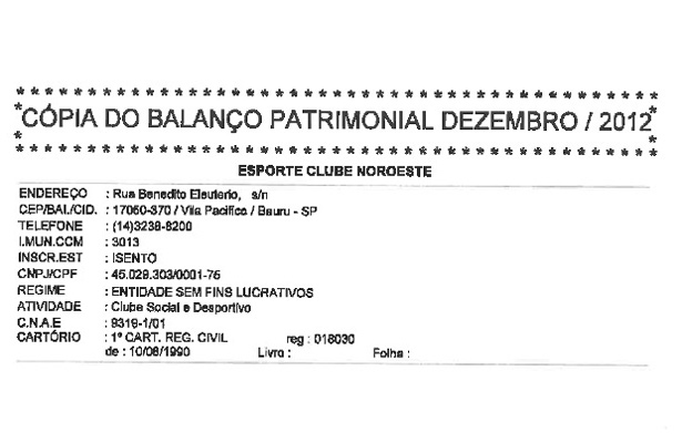 O tão falado balancete do ano de 2012 do Noroeste, que deveria ter sido entregue em abril, finalmente está publicado na site da Federação Paulista de Futebol. O atraso acabou emperrando o registro de jogadores na Copa Paulista, por exemplo. Sua publicação livra o Norusca de punições e, ao mesmo tempo, escancara a vida financeira do clube.