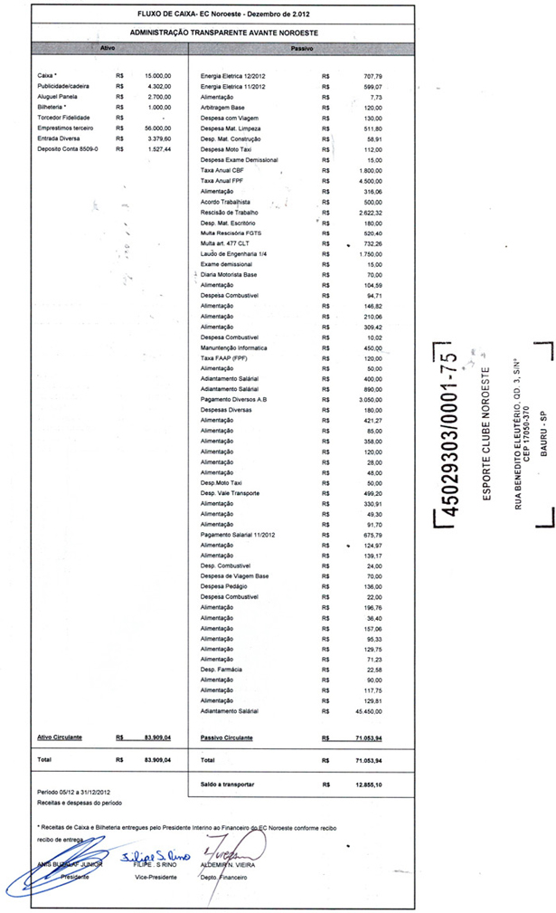 Vamos lá, prestação de serviço. A comunidade noroestina, pelas redes sociais, tem comentado o desejo de ver, detalhamente, os fluxos de caixa divulgados pelo Noroeste (de dezembro/2012, janeiro e fevereiro deste ano). Aqui no blog e em outros veículos, divulgamos números macro, o saldo, enfim, o que parecia necessário para o assunto. Entretanto, se é desejo dos torcedores e estamos falando de documentos públicos, enviados pelo clube à imprensa, aí estão eles, abaixo, em resolução que permite leitura.