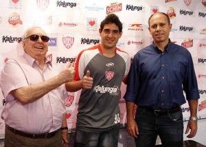 Damião apresenta Marcus Vinícius ao lado do gerente Occhiuto: pressa