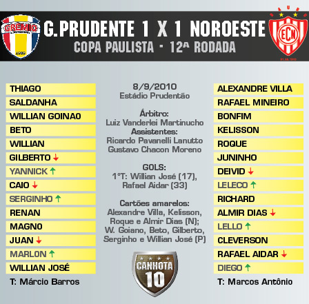 Espero que, quando começar a segunda fase, o Noroeste tenha um onze definido, entrosado, com padrão tático e vontade de vencer. Tempo para treinar, houve de sobra… Pelo que vi e ouvi até agora, o time da segunda fase seria: Yuri; Mizael, Bonfim, Geilson e Gustavo Henrique; Juninho, Hernani, Cleverson e Giovanni; Rafael Aidar e Diego. Mesmo sem ver Gustavo jogar, Roque não dá mais…
