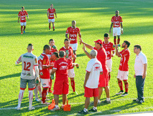 Vitão conversa com o time na parada técnica: haja conversa. Fotos: Bruno Freitas/EC Noroeste