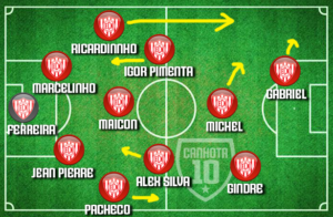 Os três volantes postados para a subida dos laterais. Ricardinho foi muito mais exigido. O lado esquerdo, aliás, funcionou mais, com as aproximações de Michel e Gabriel. Como Alex Silva e Pacheco desceram pouco, Gindre esteve isolado.