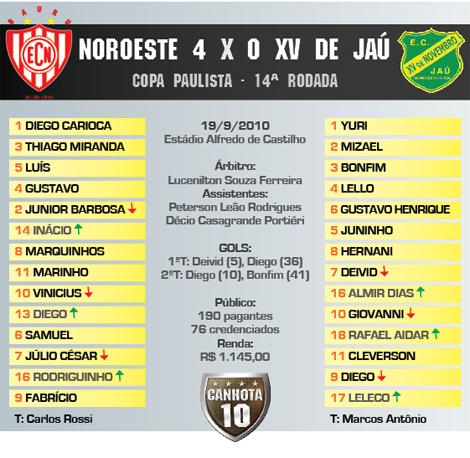 Acabaram-se os experimentos. Depois de revezar goleiros e não repetir nenhuma escalação nos primeiros dez jogos, o Noroeste chega à segunda fase com um ótimo esboço de time titular – e, melhor, com boas dúvidas. A vitória elástica sobre o XV de Jaú – obrigatória, pela fragilidade do adversário – encerra um período difícil, de muita contestação e futebol duvidoso. Que venha a próxima etapa, que não terá jogos cancelados, times fracos. Ainda dá tempo de sorrir neste semestre e garimpar nomes para o Paulistão, como o aguerrido centroavante Diego.