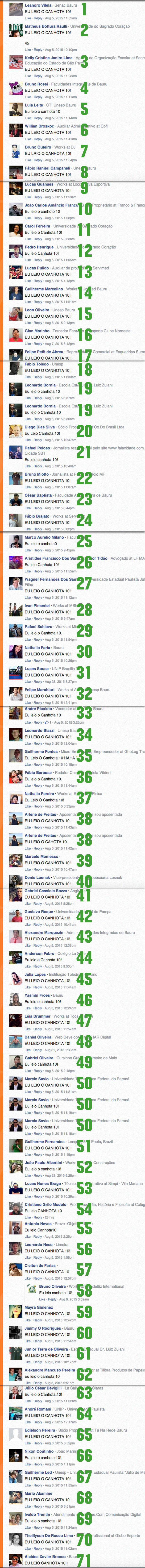 Abaixo, todos os participantes e seus respectivos números. Detalhe: TODOS que tiverem interesse vão ganhar meu livro PAIXÕES DE BAURU. Procurem-me!