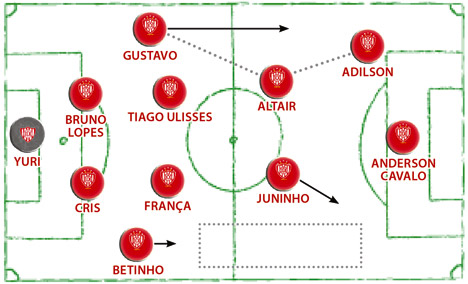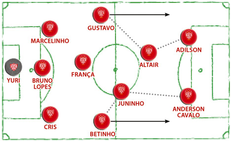 Na coletiva pós-jogo, o técnico Tuca Guimarães falou sobre a troca da plataforma de jogo durante a partida. De fato, ele migrou do 4-3-1-2 para um 4-2-1-3, como você pode conferir nas imagens abaixo.