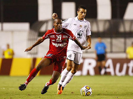Marcelinho disputa com Felipe Anderson, autor do segundo gol. Foto de Ricardo Saibun/Santos FC (inclusive home)
