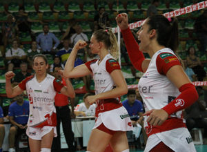Thaisinha, Valquiria e Bruna celebram mais um ponto. Fotos: Neide Carlos/Vôlei Bauru